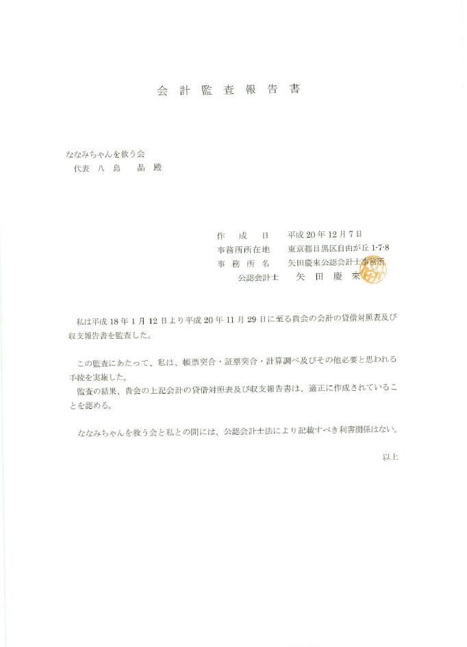 このたび、平成20年11月29日現在の収支報告をまとめ、去る平成20年12月7日、公認会計士による最終会計監査を受けましたのでご報告いたします。